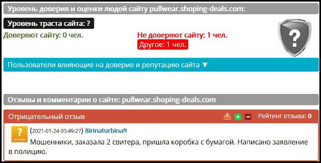 pullwear.shoping-deals.com – отзывы, осторожно мошенники 24/01/2021Рубрика: Мошенники pullwear.shoping-deals.com – отзывы, осторожно мошенники. Это опытные мошенники которые продолжают обманывать людей. Часто меняют адреса сайтов. Отзыв от пользователя.